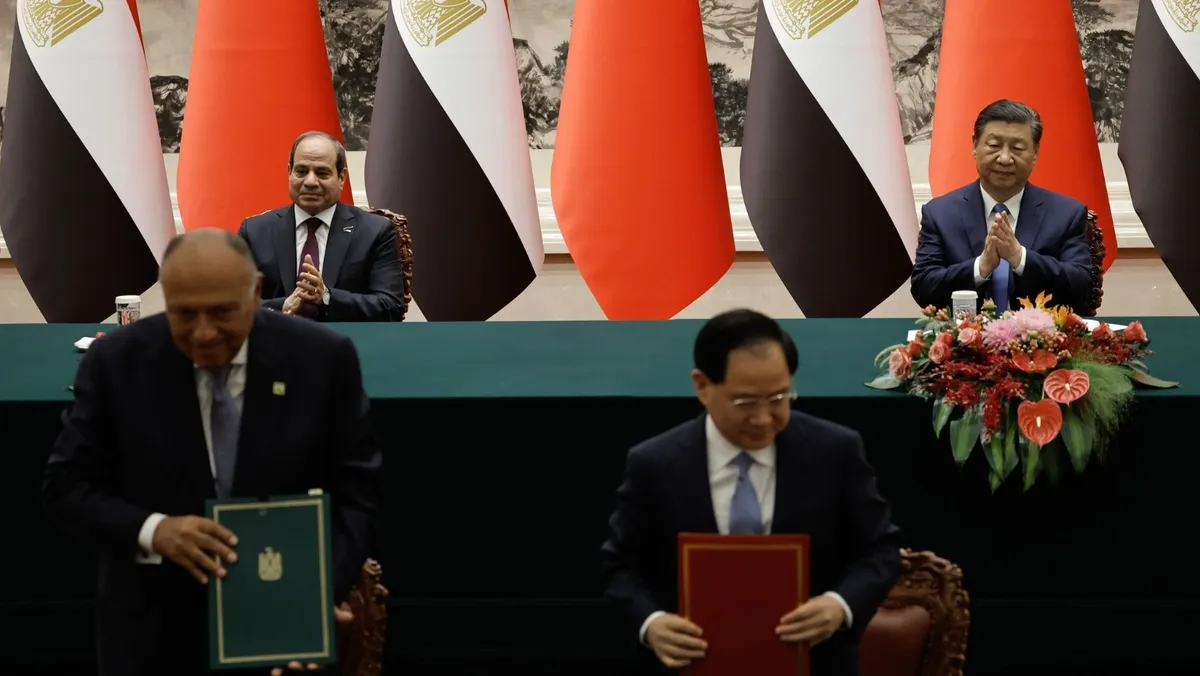 وذكرت الرئاسة المصرية، أن الرئيسين شهدا مراسم التوقيع على عدد من اتفاقيات التعاون بين البلدين، ومن بينها خطة التطوير المشترك لمبادرة الحزام والطريق.