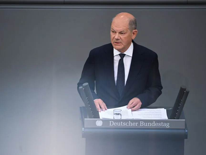 المستشار الألماني أولاف شولتز خلال خطاب أمام 'البوندستاج' في برلين بشأن القضايا الأمنية التي تواجه ألمانيا. 6 يونيو 2024 - Reuters