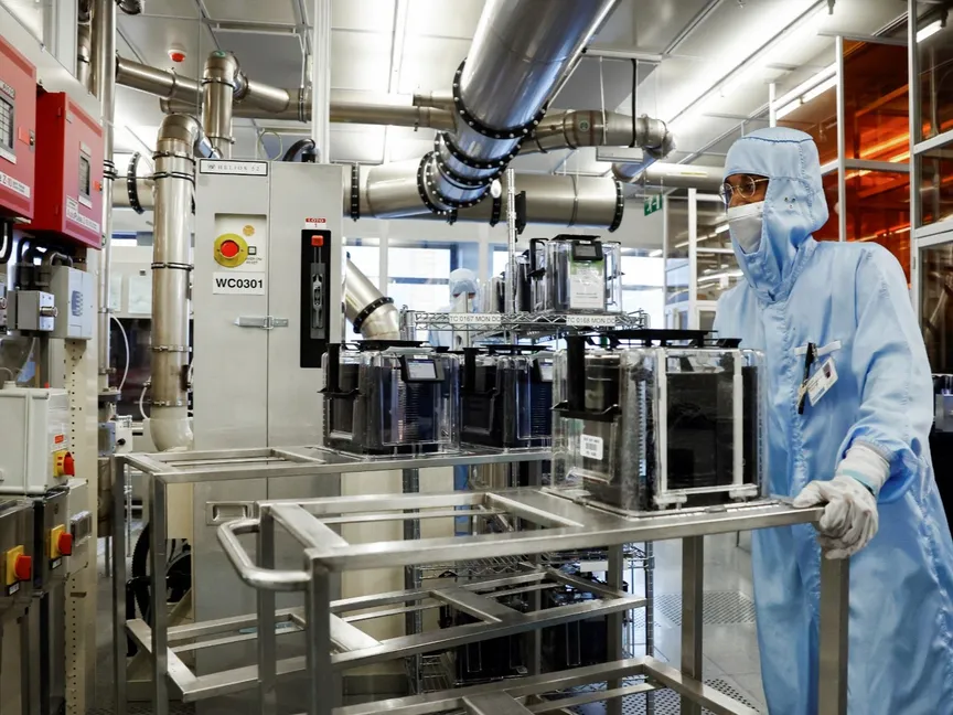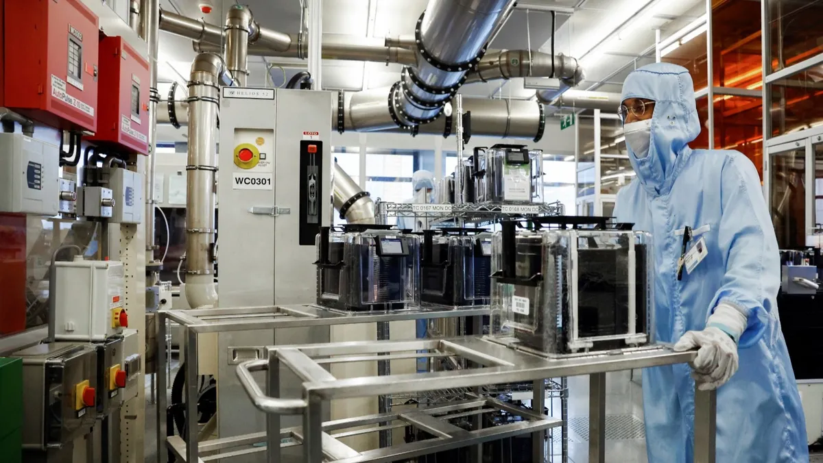 عامل ينقل مجموعة من الرقائق في مصنع تصنيع شرائح الكمبيوتر التابع لشركة NXP في نايميخين، هولندا. 14 مارس 2024 - Reuters