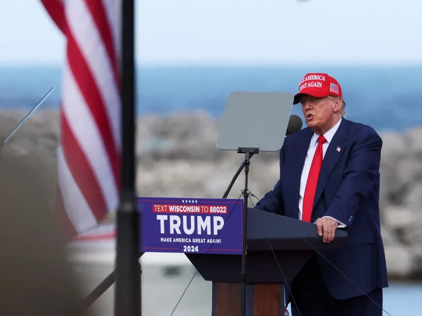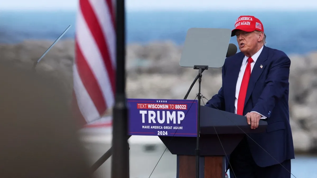 الرئيس الأميركي السابق والمرشح الجمهوري للرئاسة دونالد ترمب خلال كلمة ضمن حملته الانتخابية في راسين بولاية ويسكونسن. 18 يونيو 2024. - REUTERS
