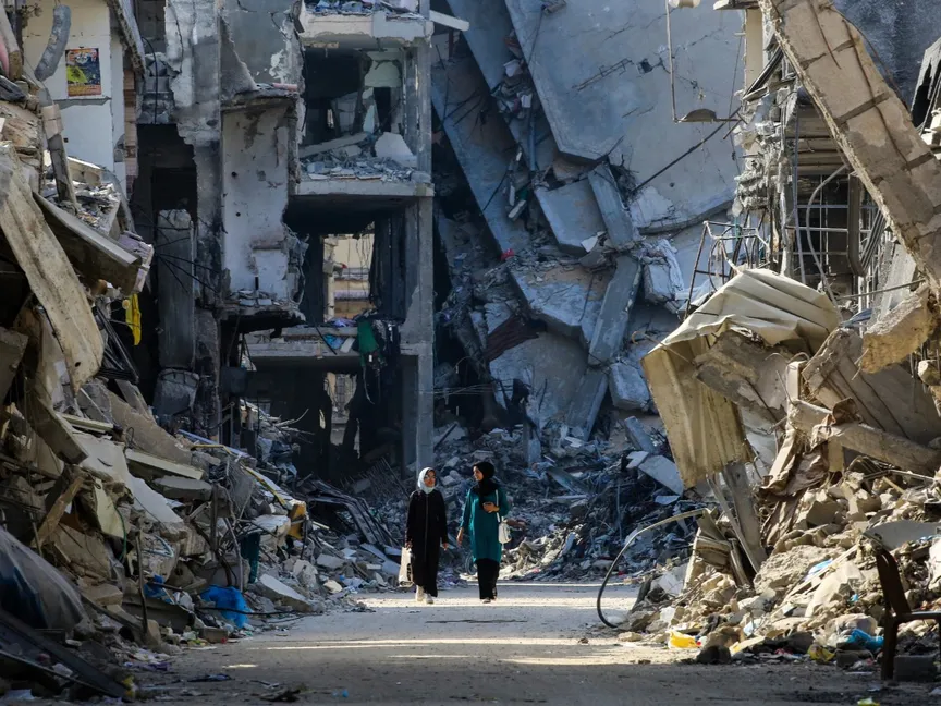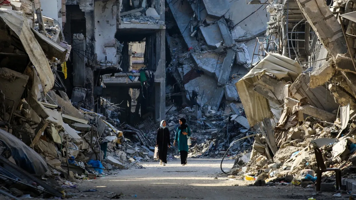 فلسطينيتان تسيران وسط مباني مدمرة جراء القصف الإسرائيلي على خان يونس، قطاع غزة. 20 يونيو 2024 - AFP