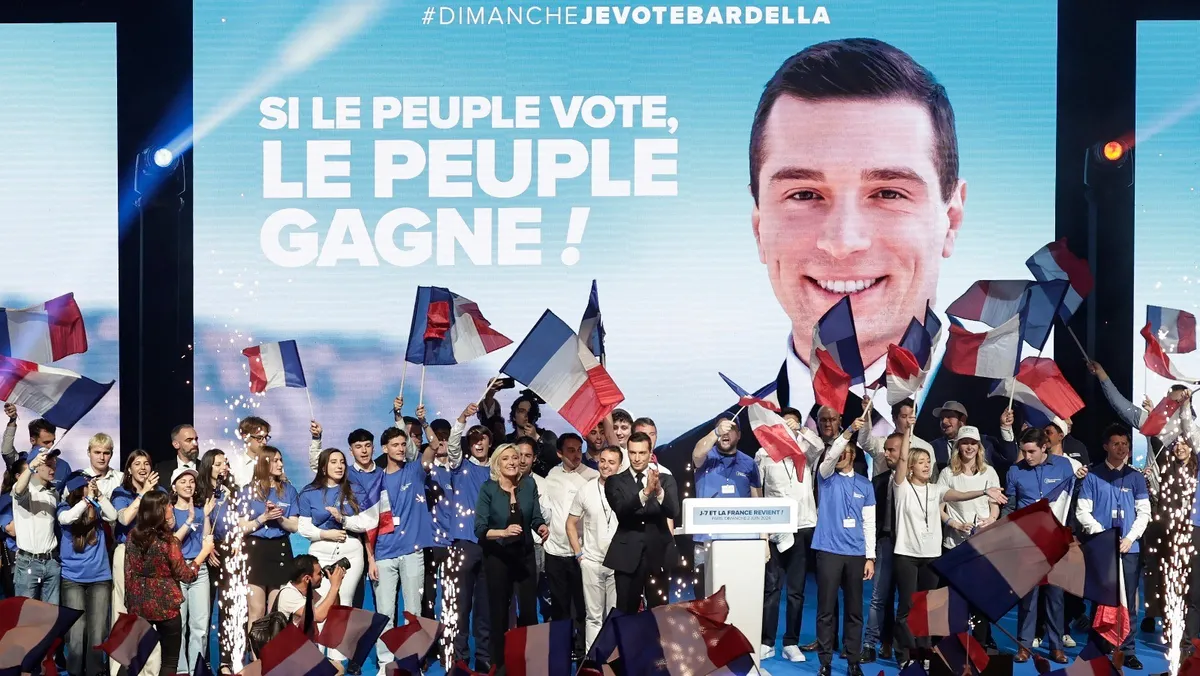 المرشح الرئيسي لحزب التجمع الوطني اليميني الفرنسي جوردان بارديلا ورئيسة المجموعة البرلمانية لحزب RN مارين لوبان خلال اجتماع الحملة الانتخابية قبل انتخابات البرلمان الأوروبي المقبلة، باريس، 2 يونيو. 2024 - AFP