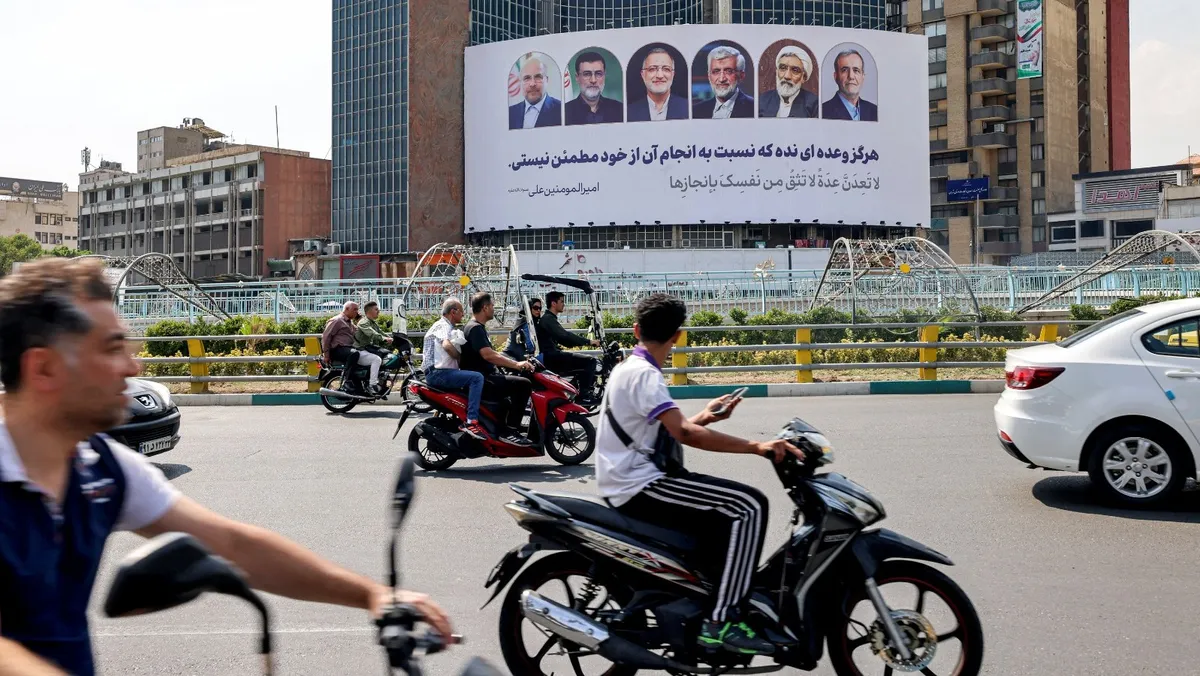 مركبات تمر أمام لوحة إعلانية تعرض صور مرشحي انتخابات الرئاسة الإيرانية في ميدان ولي عصر بوسط طهران. 15 يونيو 2024 - AFP