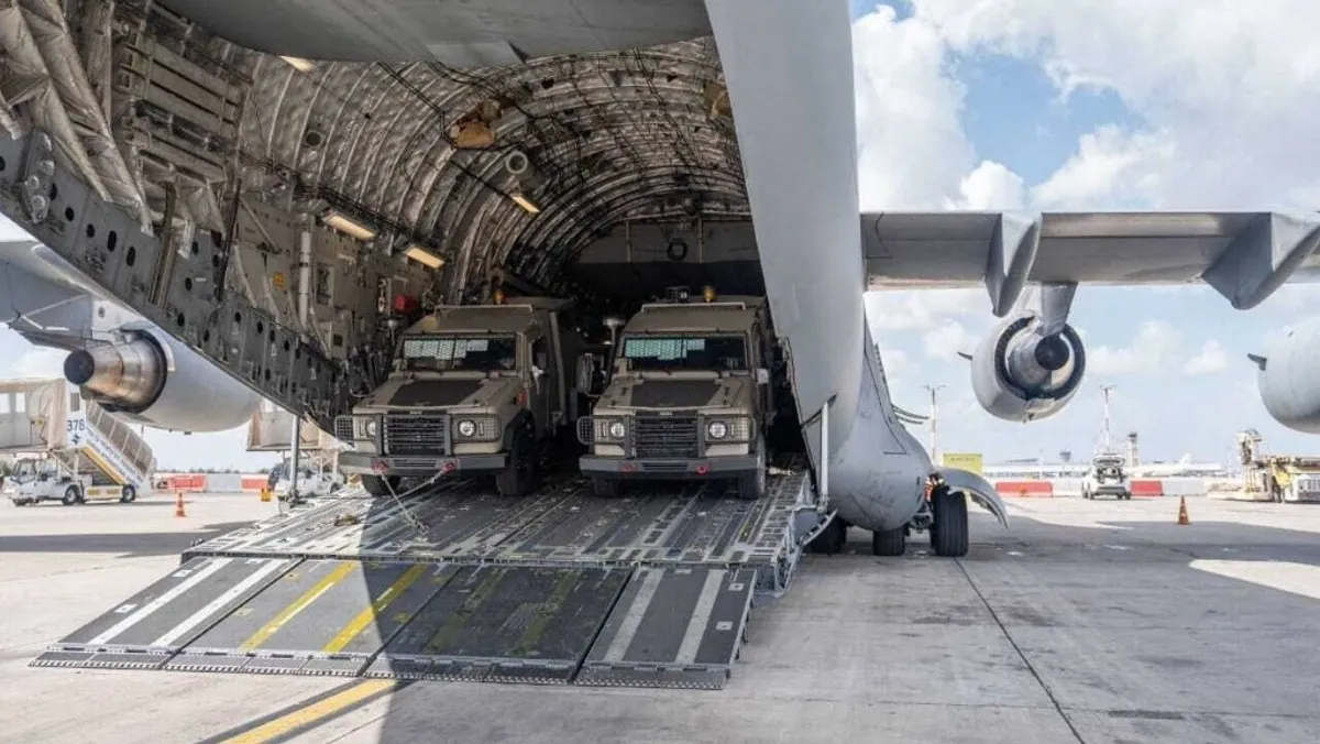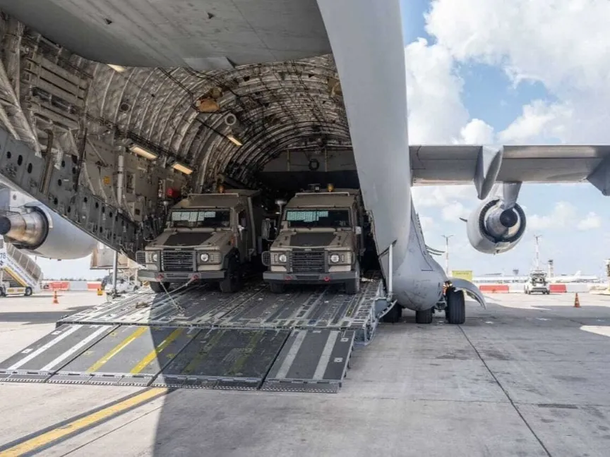 طائرة شحن عسكرية أميركية تحمل سيارات مدرعة ضمن مساعدات عسكرية أميركية عاجلة لإسرائيل في مطار في تل أبيب. 19 أكتوبر 2023 - AFP
