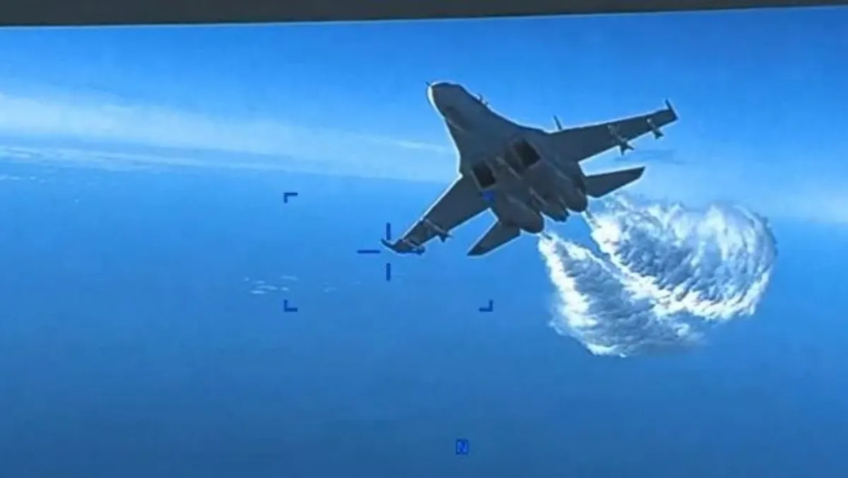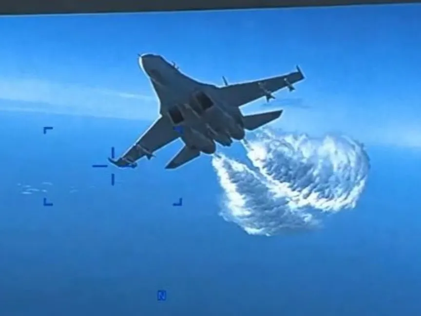 صورة تشرتها القيادة الأميركية الأميركية في أوروبا لاعتراض مقاتلة روسية لمسيرتها والتي سقطت في البحر الأسود. - https://twitter.com/US_EUCOM
