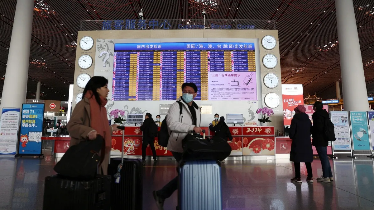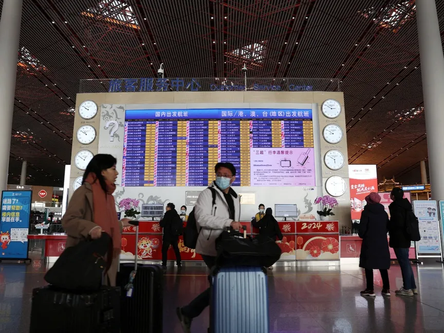 مسافرون يمرون أمام شاشة تعرض معلومات الرحلات المغادرة في مطار بكين الدولي- 2 فبراير 2024 - Reuters