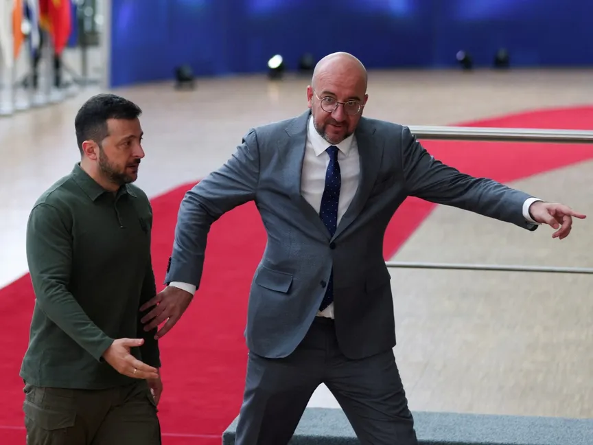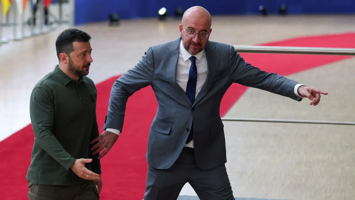 الرئيس الأوكراني فولوديمير زيلينسكي ورئيس المجلس الأوروبي تشارلز ميشيل يحضران قمة قادة الاتحاد الأوروبي في بروكسل. 27 يونيو 2024 - REUTERS