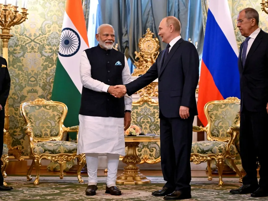 استقبل الرئيس الروسي فلاديمير بوتين الثلاثاء، رئيس الوزراء الهندي ناريندرا مودي في الكرملين، واصفاً العلاقات بين موسكو ونيودلهي بأن لها "طابعاً استراتيجياً مميزاً"، مشيراً إلى أن التبادل التجاري بين البلدين زاد بنسبة 60% خلال العام الماضي.