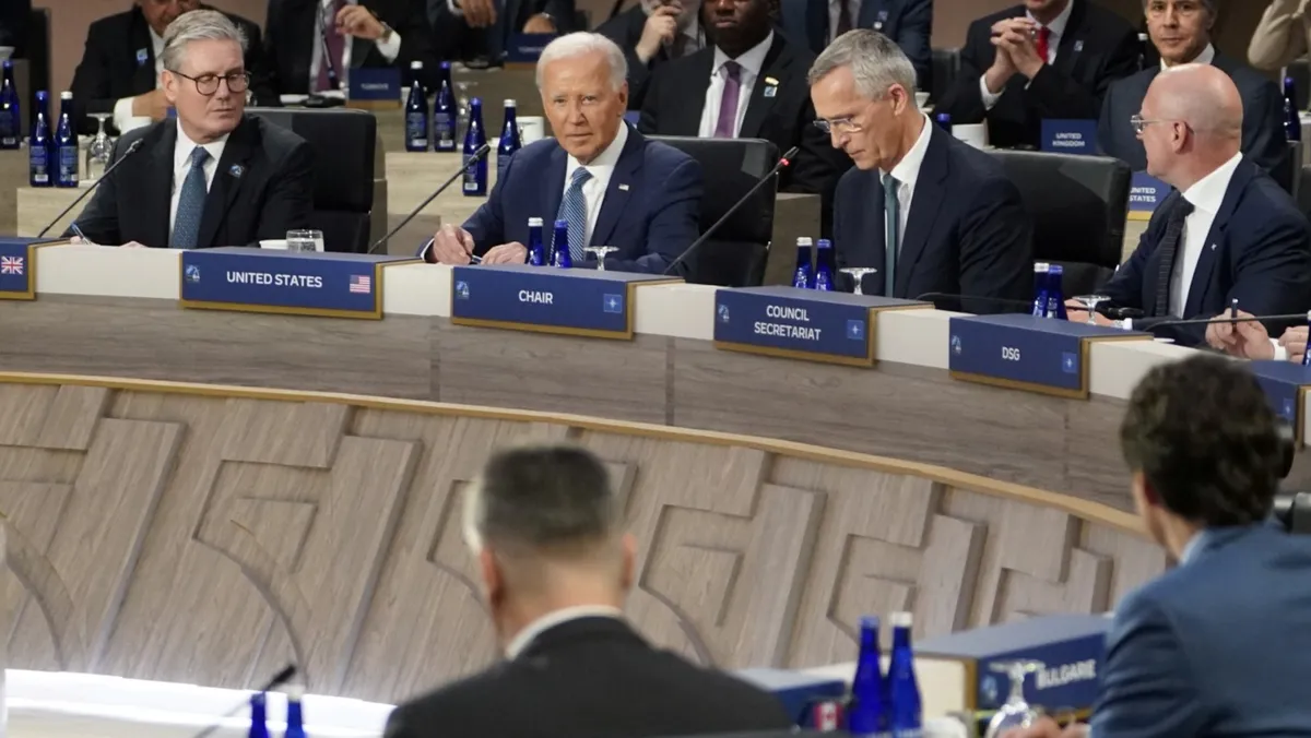 الرئيس الأمريكي جو بايدن يتحدث خلال اجتماع في قمة حلف شمال الأطلسي "الناتو" في واشنطن. 10 يوليو 2024 - Reuters