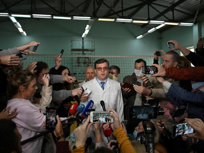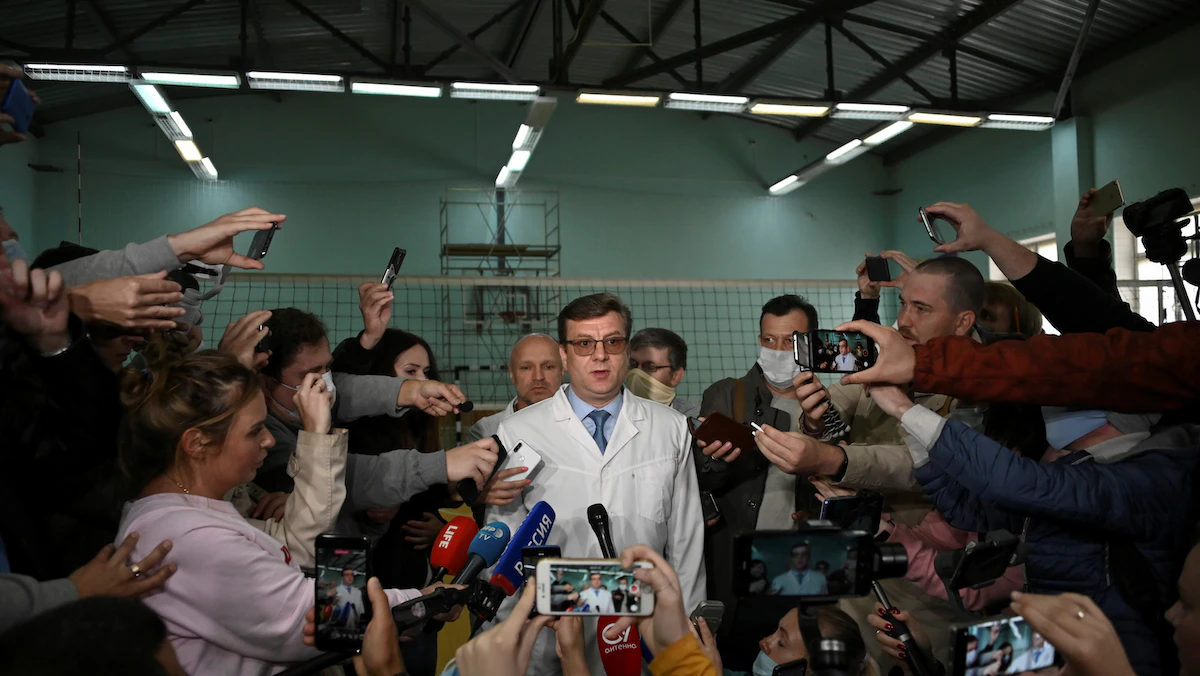 الطبيب الروسي ألكسندر موراخوفسكي يتحدث للصحافيين عن الوضع الصحي لنافالني في أومسك- 21 أغسطس 2020 - REUTERS