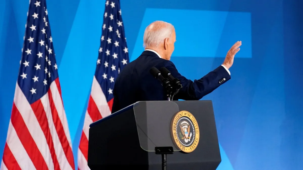 الرئيس الأميركي جو بايدن يلوح في مؤتمر صحافي خلال قمة الذكرى 75 لحلف الناتو في واشنطن بالولايات المتحدة. 11 يوليو 2024 - REUTERS