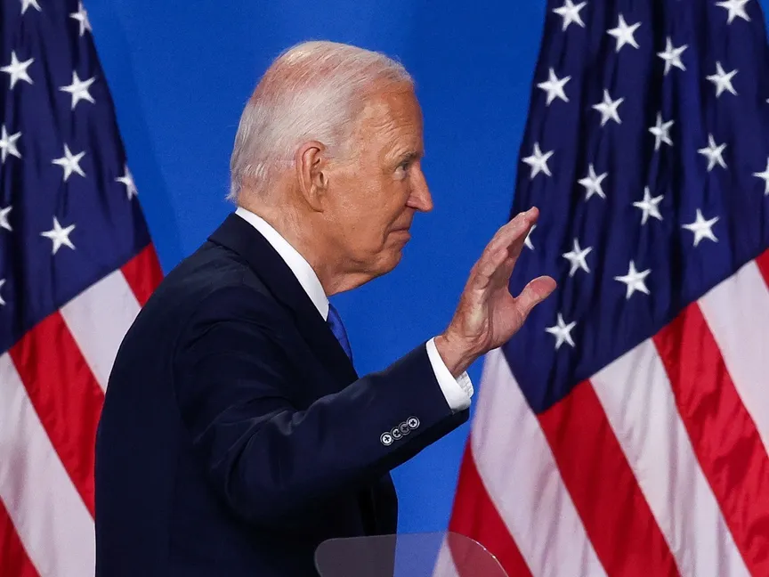 الرئيس الأميركي جو بايدن أثناء مغادرته مؤتمر صحافي خلال قمة حلف الناتو في واشنطن. 11 يوليو 2024 - REUTERS