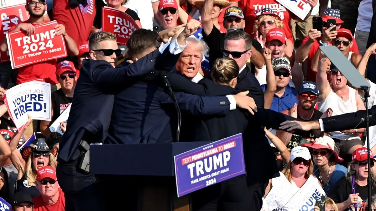 الرئيس الأميركي السابق دونالد ترمب محاط بعملاء الخدمة السرية عقب إطلاق النار عليه في تجمع انتخابي بولاية بنسلفانيا. 13 يوليو 2024 - Bloomberg