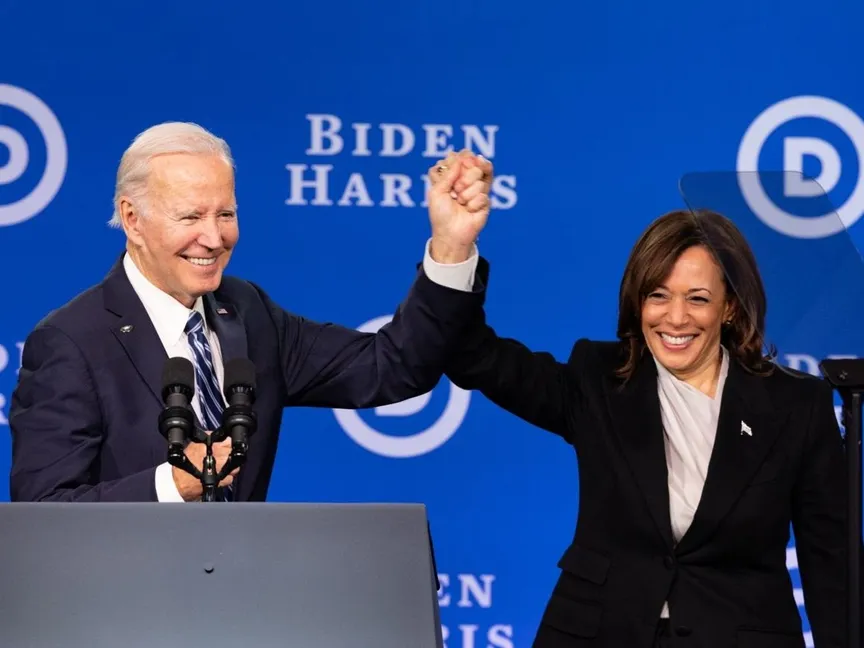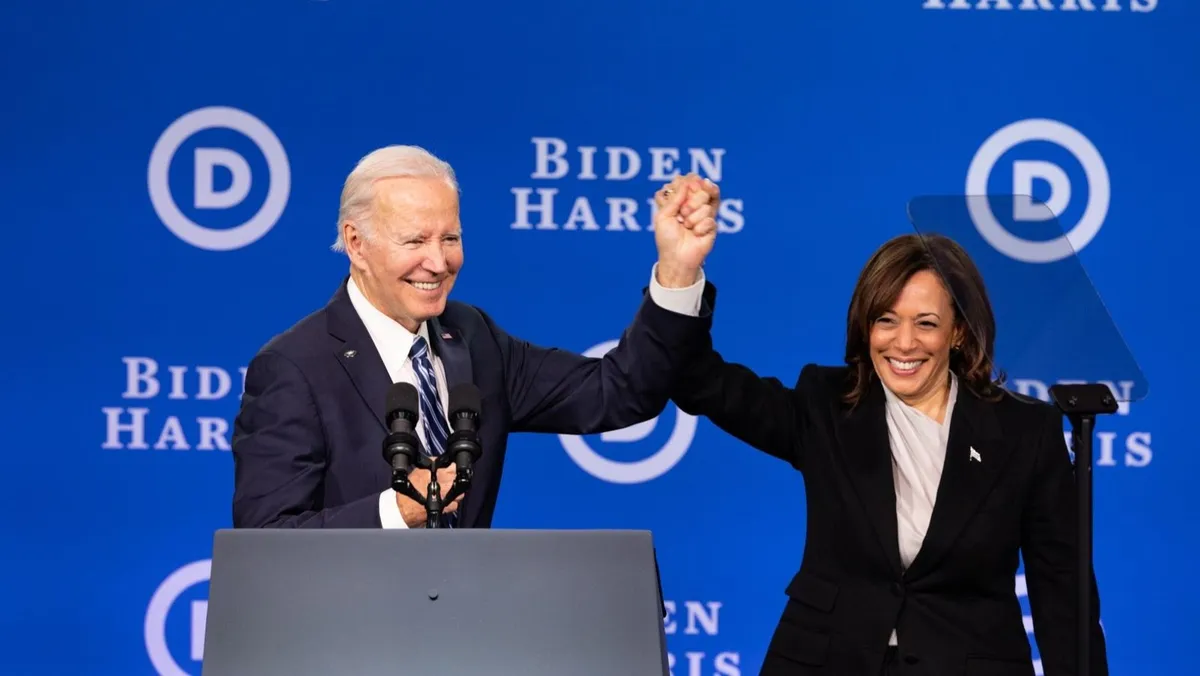 الرئيس الأميركي جو بايدن يمسك بيد نائبة الرئيس كامالا هاريس خلال اجتماع للجنة الوطنية الديمقراطية في فيلادلفيا- 3 فبراير 2023 - Bloomberg
