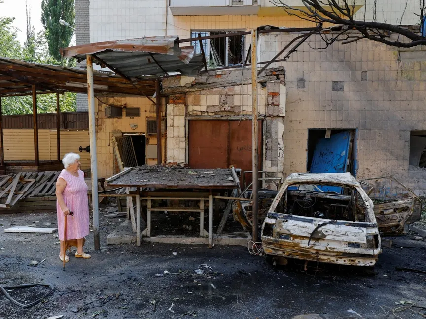 امرأة تسير في موقع قصف حديث وصفته السلطات المحلية التي نصبتها روسيا بضربة عسكرية أوكرانية في دونيتسك، أوكرانيا. 22 يوليو 2024 - Reuters