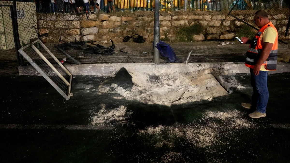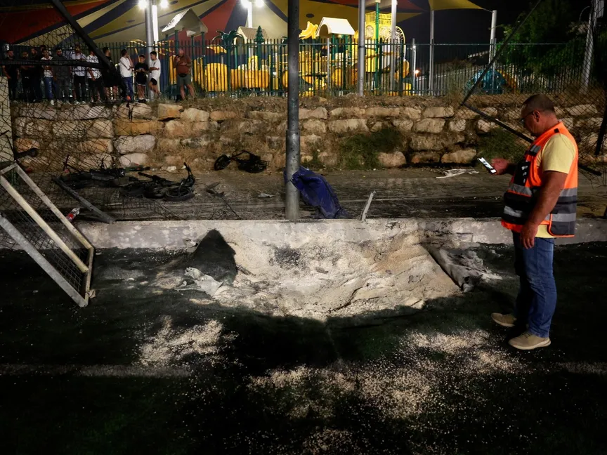 أحد أفراد فرق الإسعاف الإسرائيلية يتفقد المنطقة التي سقط عليها الصاروخ في بلدة مجدل شمس بالجولان السوري المحتل. 27 يوليو 2024 - REUTERS