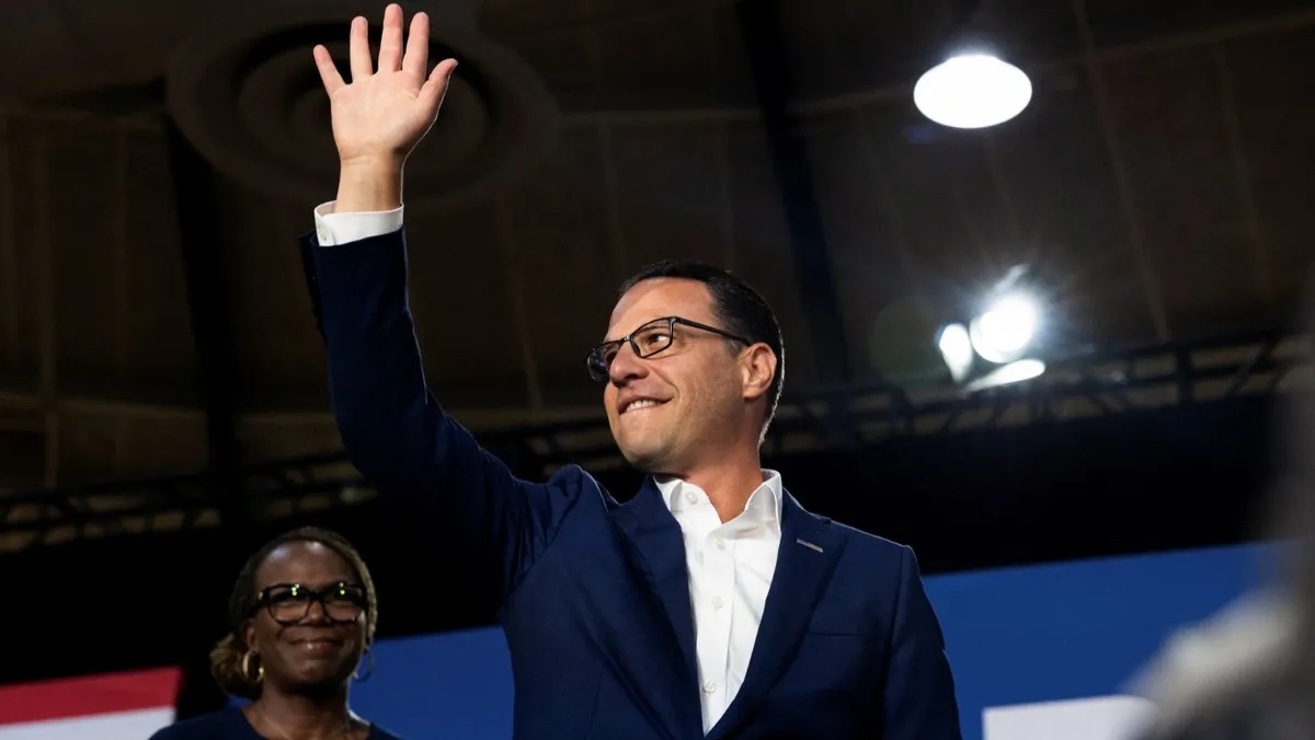 حاكم ولاية بنسلفانيا جوش شابيرو خلال تجمع لدعم الحملة الانتخابية الرئاسية الديمقراطية لكامالا هاريس في أمبلر. 29 يوليو 2024 - Reuters