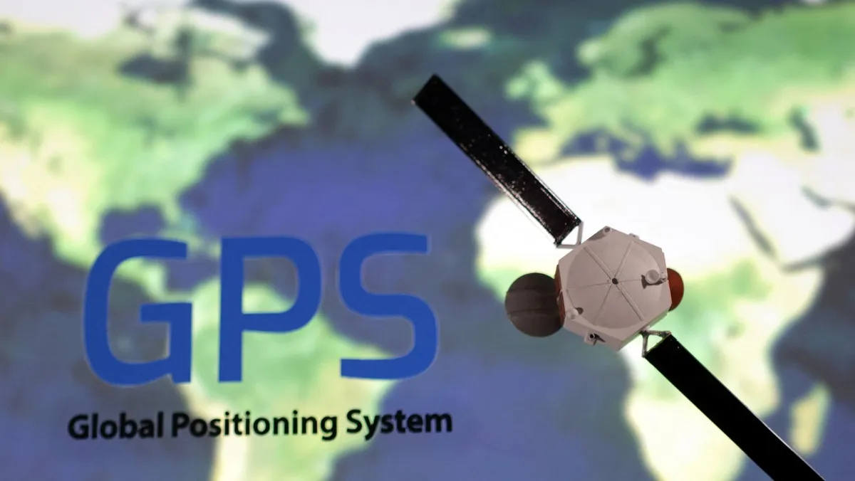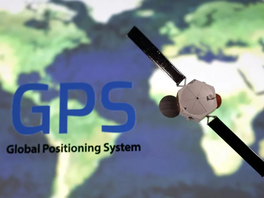 رسم توضيحي يظهر شعار GPS (النظام العالمي لتحديد المواقع) مع نموذج الأقمار الصناعية الموضوعة على الخريطة. 25 سبتمبر 2022 - Reuters