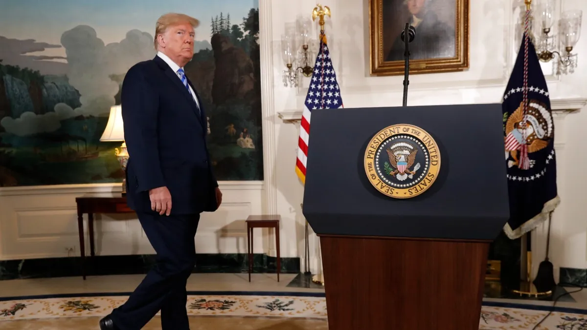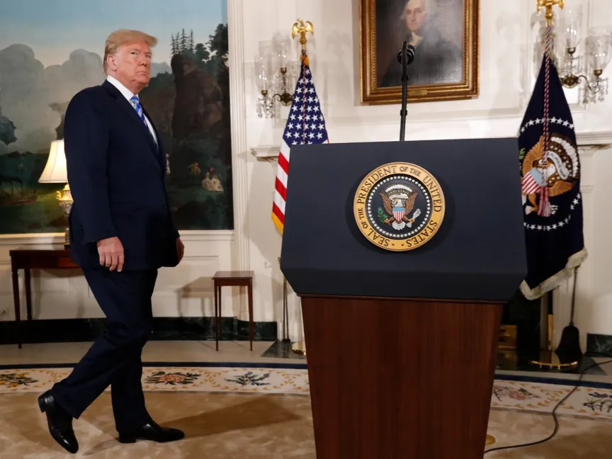 الرئيس الأميركي السابق دونالد ترمب في البيت الأبيض قبيل إعلان انسحاب واشنطن من الاتفاق النووي مع إيران. 8 مايو 2018 - REUTERS