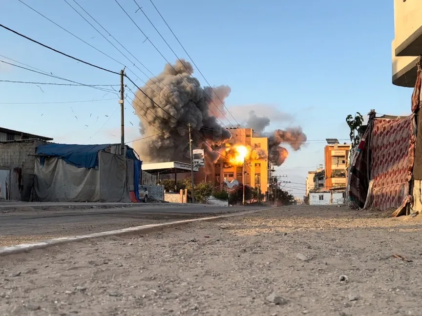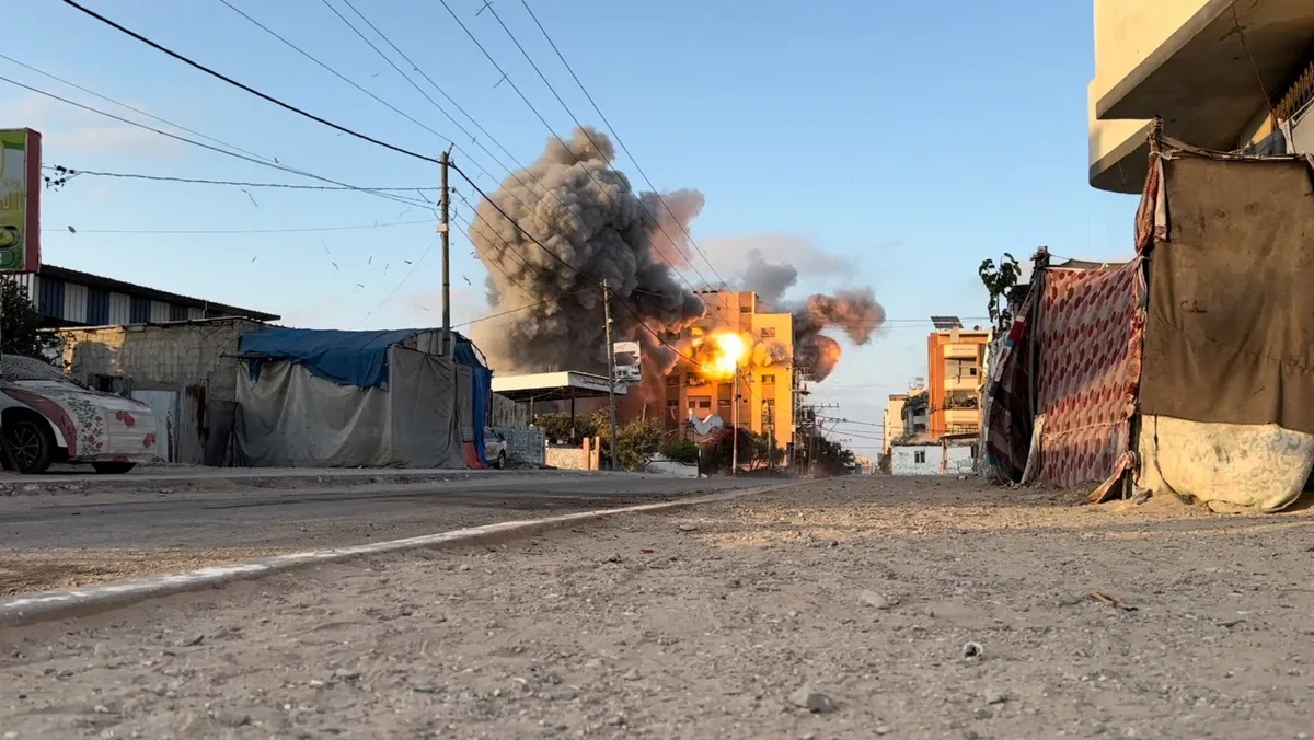 دخان وألسنة لهب تتصاعد بعد غارة إسرائيلية على مبنى سكني في وسط قطاع غزة. 17 أغسطس 2024 - REUTERS