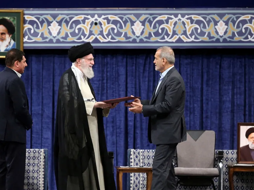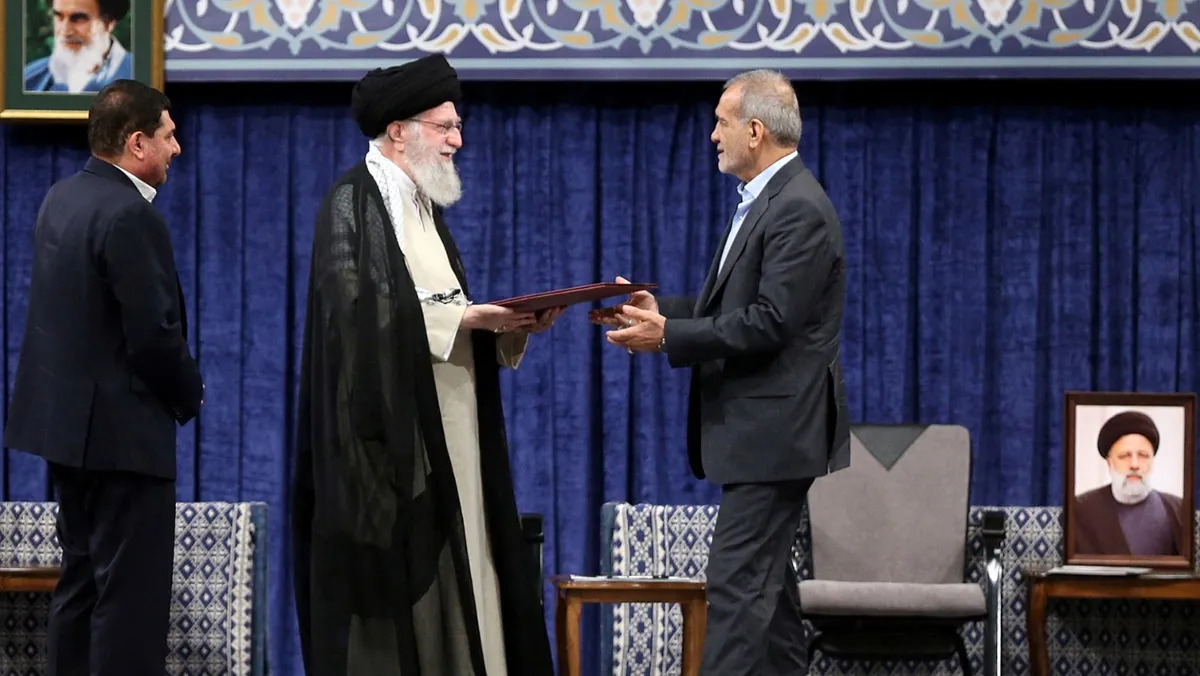 المرشد الإيراني علي خامنئي خلال مراسم تنصيب مسعود بيزشكيان رئيساً في طهران. 28 يوليو 2024 - REUTERS