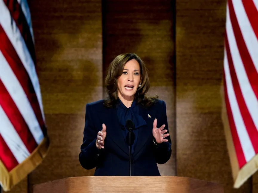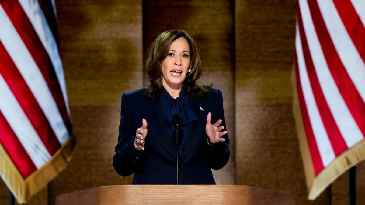 نائبة الرئيس الأمريكي كامالا هاريس تتحدث خلال المؤتمر الوطني للحزب االديمقراطي في شيكاجو. 22 أغسطس 2024. - Bloomberg