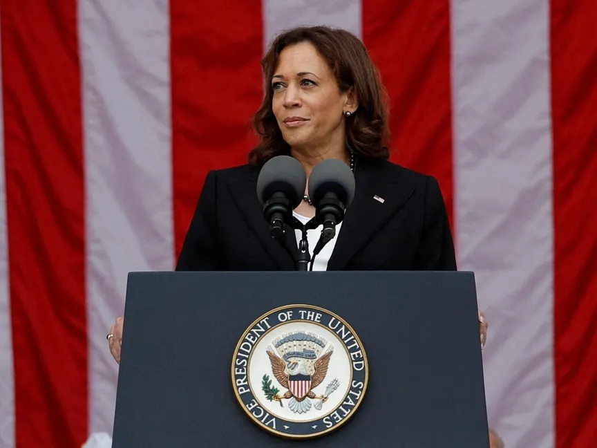 نائبة الرئيس الأميركي كامالا هاريس خلال مناسبة في مقبرة أرلينجتون الوطنية بولاية فيرجينيا- 11 نوفمبر 2022 - REUTERS