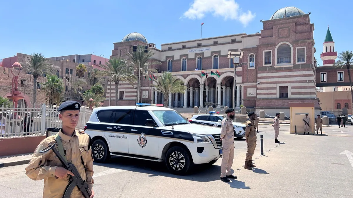 قوات أمن ليبية تقف أمام مقر المصرف المركزي الليبي في طرابلس.27 أغسطس 2024 - Reuters