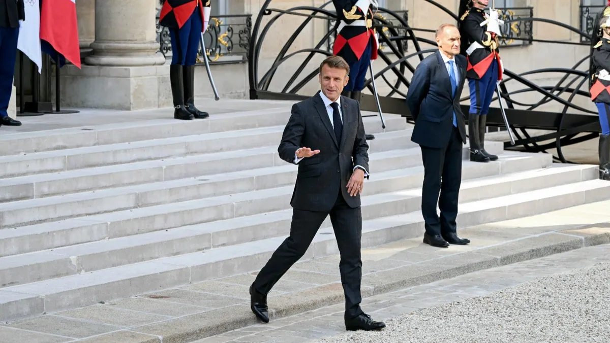 الرئيس الفرنسي إيمانويل ماكرون يسير لاستقبال رئيس الوزراء البريطاني كير ستارمر أثناء وصول ستارمر إلى قصر الإليزيه في باريس. 29 أغسطس 2024 - Reuters