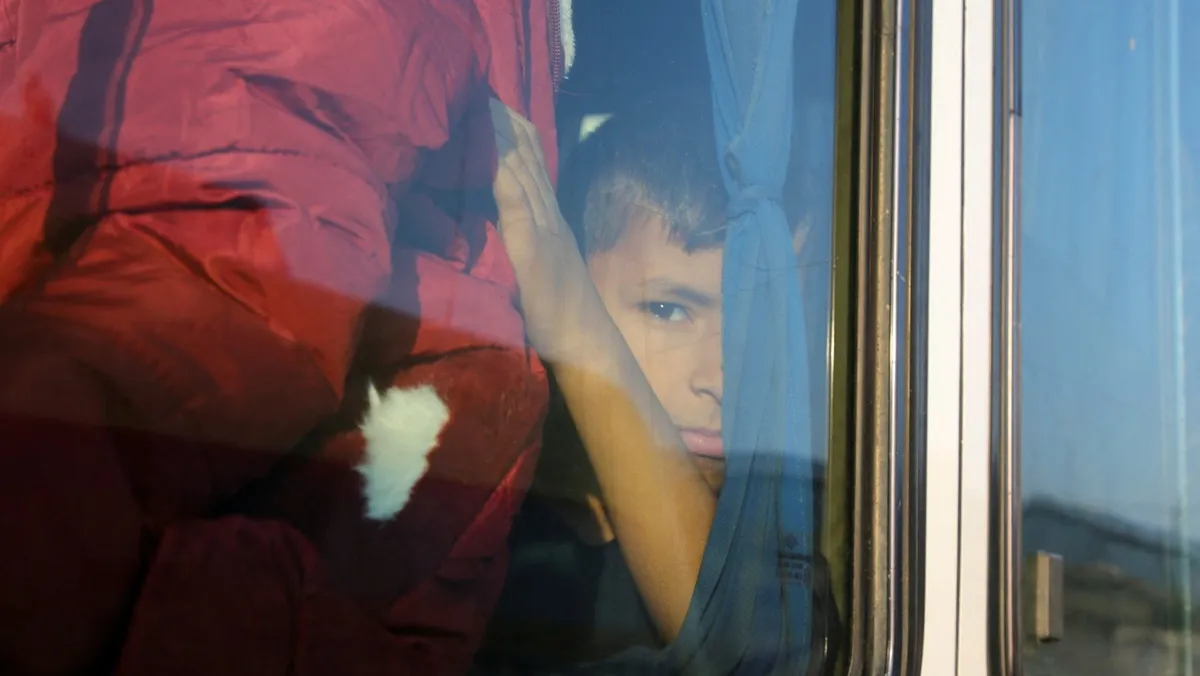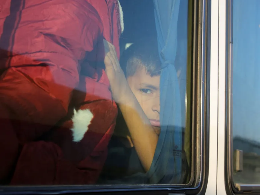 طفل فلسطيني مريض ينظر من نافذة حافلة في خان يونس أثناء نقله لتلقي العلاج الطبي خارج قطاع غزة. 6 نوفمبر 2024 - reuters