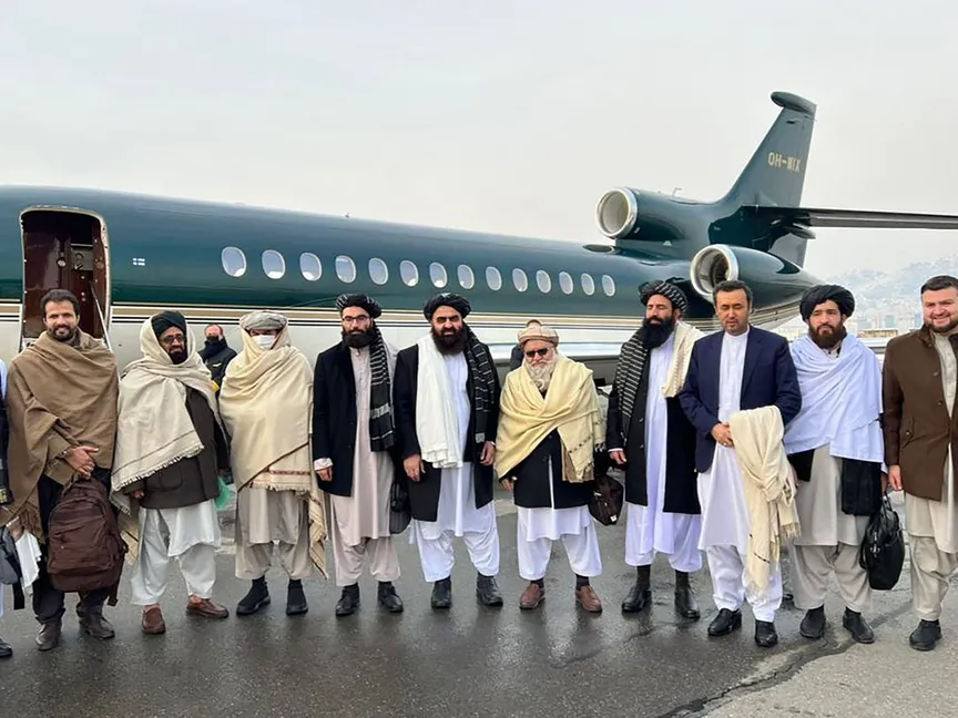 صورة نشرتها حركة طالبان الأفغانية لوزير الخارجية الأفغاني أمير خان متقي (وسطاً)، والمسؤول البارز في طالبان أنس حقاني (يميناً) ومندوبين يقفون لالتقاط الصور قبل مغادرتهم إلى أوسلو، في مطار كابول بأفغانستان. 22 يناير 2022 - AFP