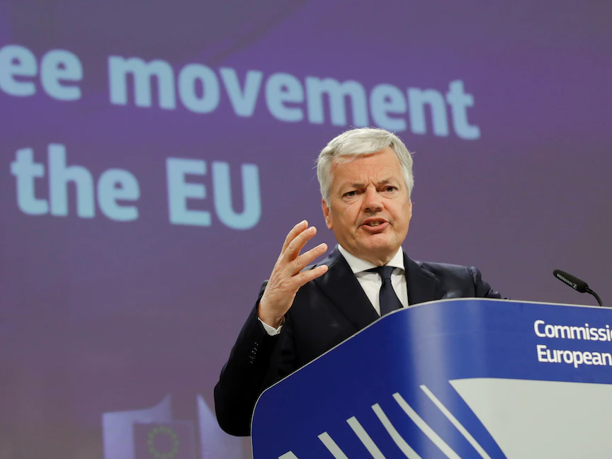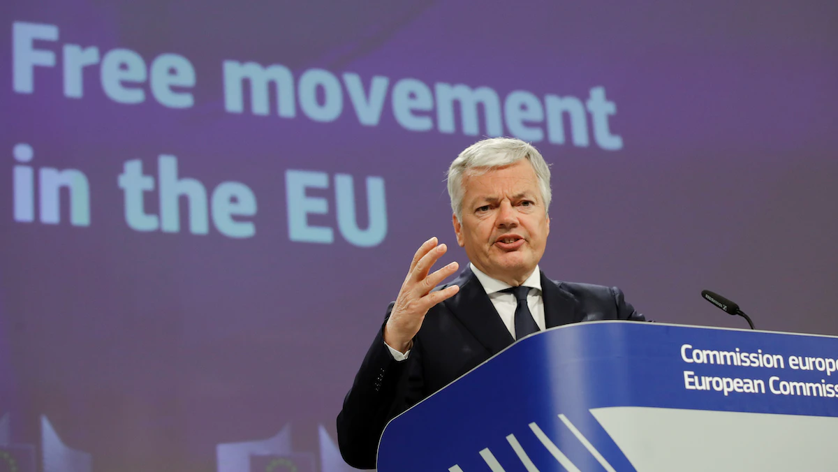 المفوض الأوروبي ديدييه رايندرز يعقد مؤتمراً صحافياً بشأن توصيات وتدابير حرية التنقل داخل الاتحاد الأوروبي في بروكسل. 31 مايو 2021 - REUTERS