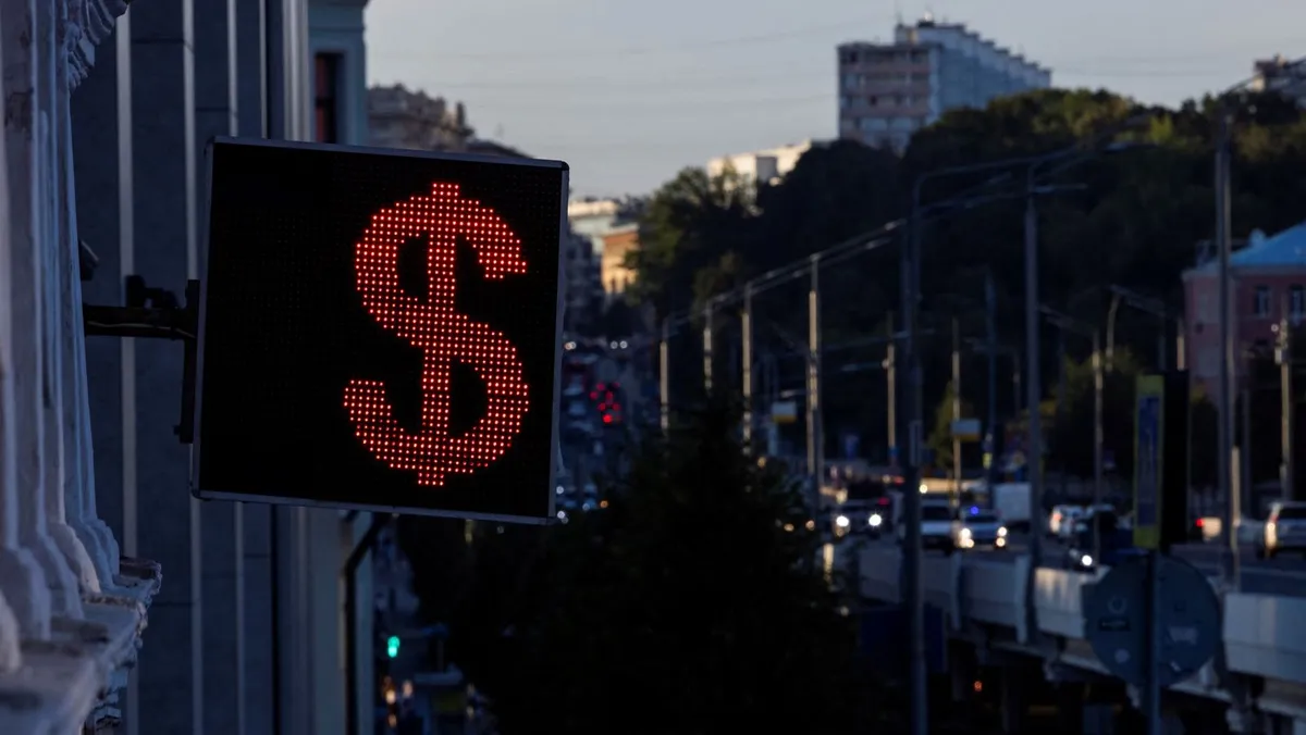 لوحة إلكترونية تعرض شعار الدولار الأميركي في أحد شوارع العاصمة الروسية موسكو. 17 أغسطس 2023 - REUTERS