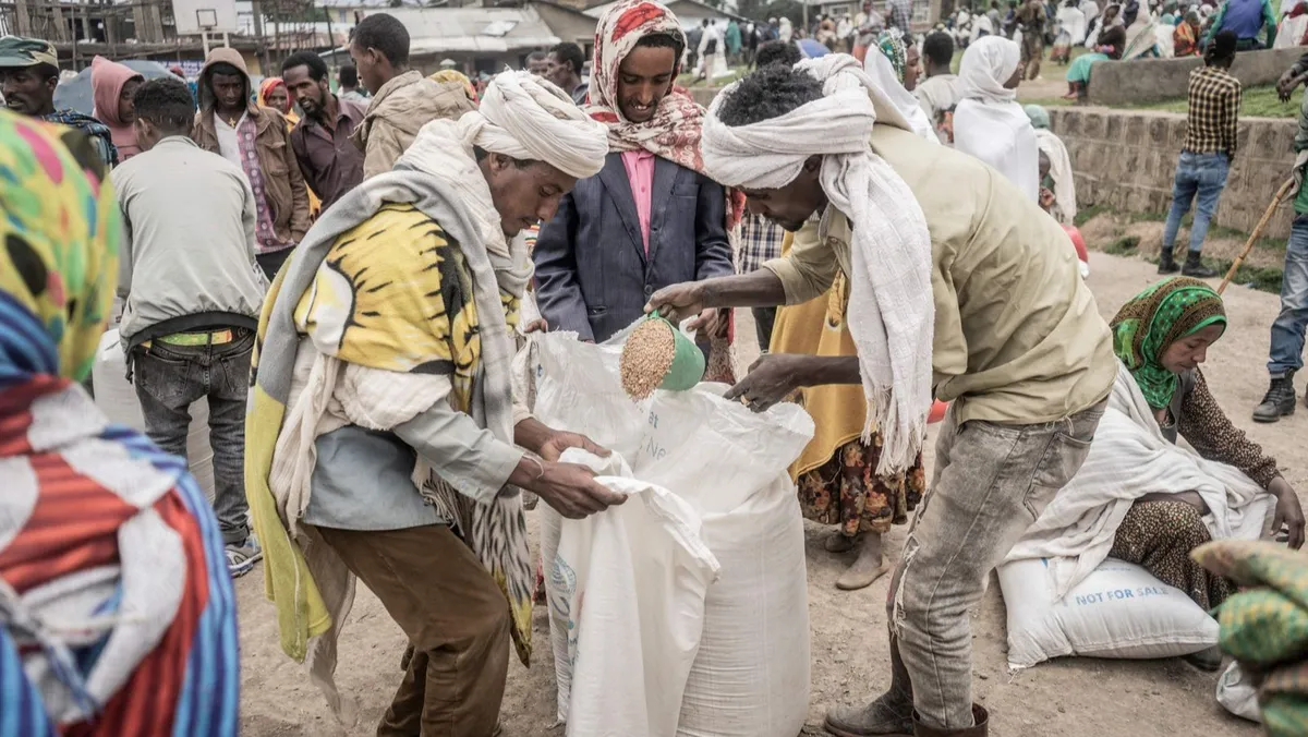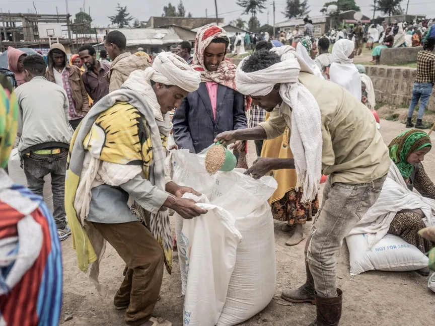 أشخاص فروا من الحرب في مخيم للنازحين داخلياً تم بناؤه مؤقتاً لاستلام أكياس القمح الأولى من برنامج الغذاء العالمي في ديبارك، إثيوبيا، 15سبتمبر 2021 - AFP