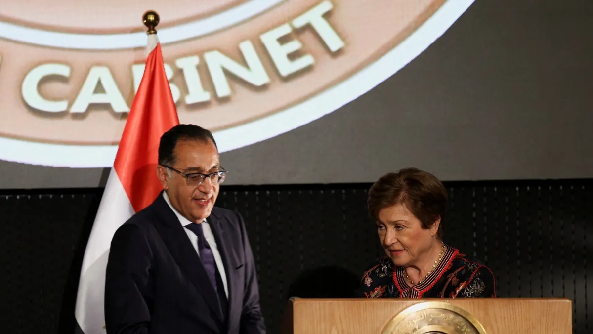 رئيس الوزراء المصري مصطفى مدبولي خلال مؤتمر صحافي مع مديرة صندوق النقد الدولي كريستالينا جورجيفا بالعاصمة الإدارية الجديدة شرقي القاهرة. 3 نوفمبر 2024 - REUTERS