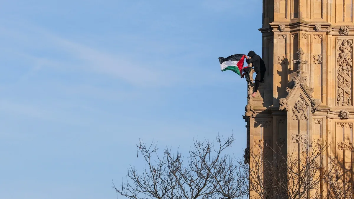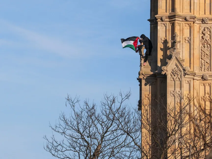 ذكرت شبكة "سكاي نيوز" البريطانية أن رجلاً تسلق برج إليزابيث، الذي يضم ساعة بيج بن الشهيرة في قصر وستمنستر بلندن، ولوح بالعلم الفلسطيني نزل بعد 16 ساعة.