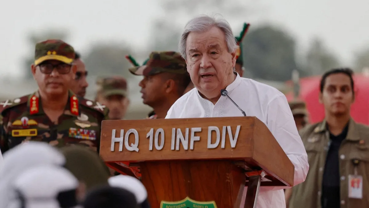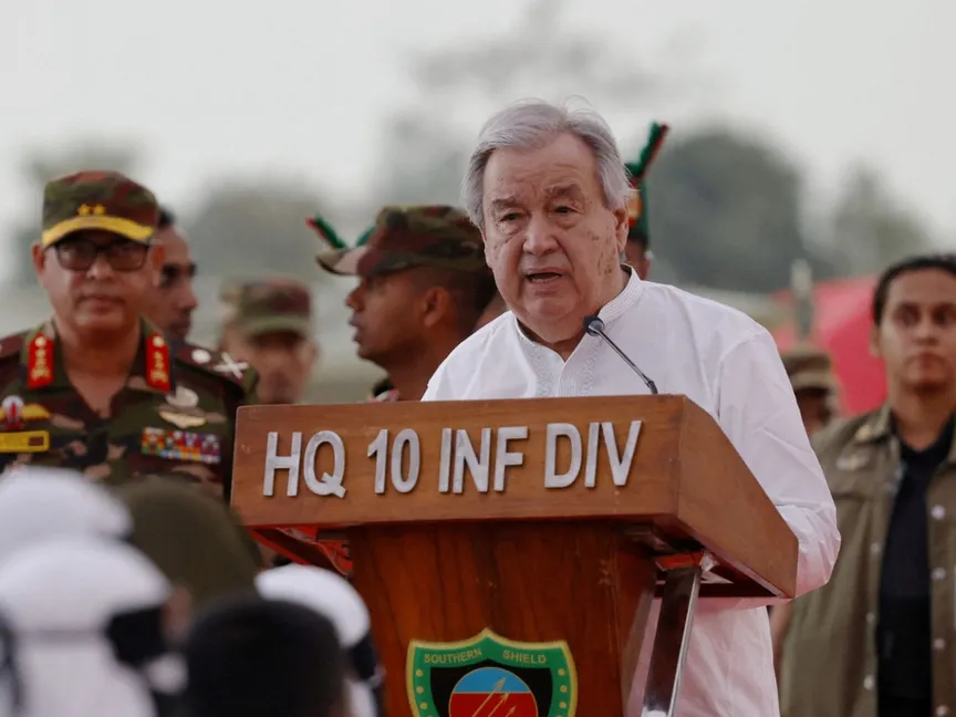 الأمين العام للأمم المتحدة أنطونيو جوتيريش يلقي كلمة أثناء حضوره إفطار رمضان التضامني مع آلاف من الروهينجا في بنجلاديش. 14 مارس 2025 - reuters