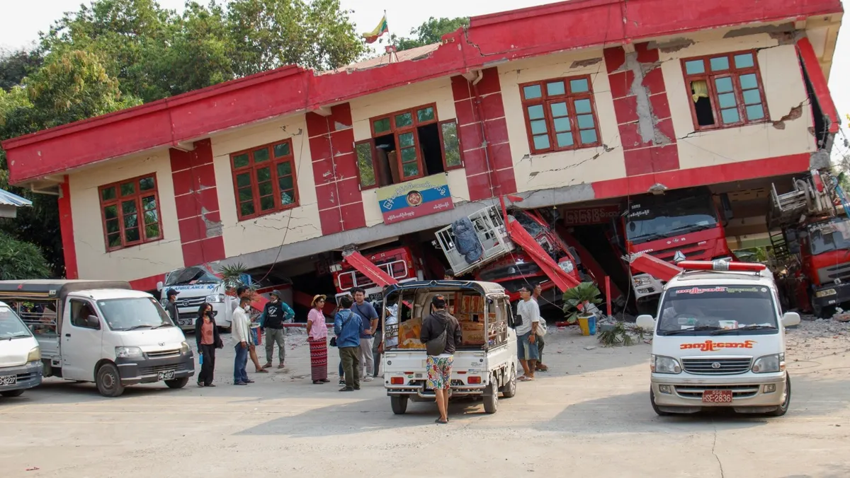 أشخاص يقفون بجوار محطة إطفاء منهارة بعد زلزال قوي في ساجينج بميانمار. 31 مارس 2025 - Reuters