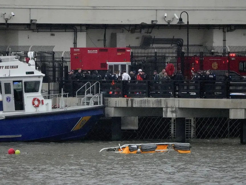 أفراد الطوارئ يعملون في موقع تحطم طائرة مروحية  في نهر هدسون بنيويورك. 10 أبريل 2025 - Reuters