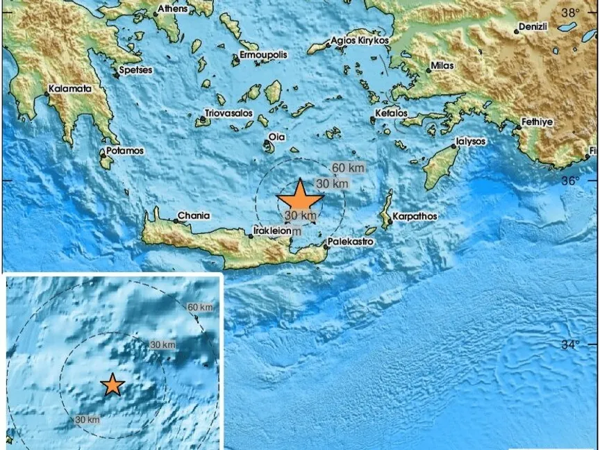 وفي مصر، أعلن المعهد القومي للبحوث الفلكية بأن محطات الشبكة القومية لرصد الزلازل التابعة له رصدت "هزة أرضية في جزيرة كريت على بعد 499 كيلو متر شمال مرسى مطروح في الساعة (6:19 صباحاُ بتوقيت القاهرة)، بقوة 6.24 درجة على مقياس ريختر".