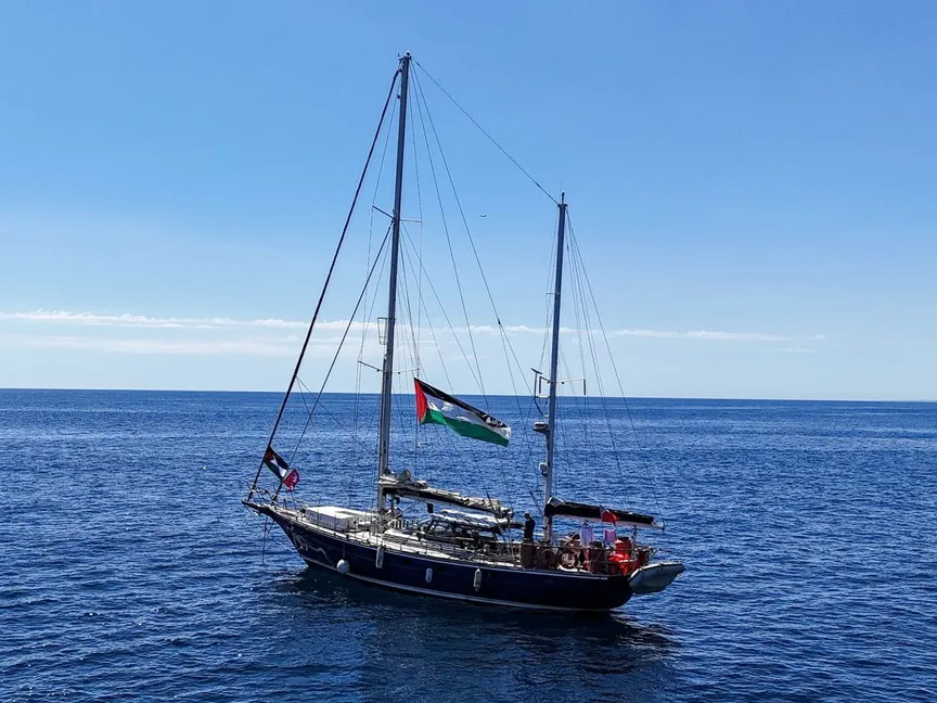 سفينة المساعدات "مادلين" المتجهة إلى غزة، والتي نظمتها منظمة تحالف أسطول الحرية، وهي راسية قبالة سواحل كاتانيا بإيطاليا، في الأول من يونيو 2025 - REUTERS
