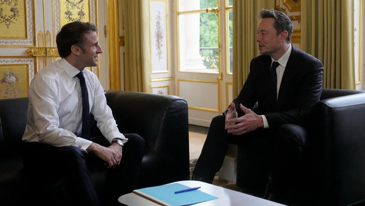 الرئيس الفرنسي إيمانويل ماكرون خلال استقبال الملياردير الأميركي إيلون ماسك في قصر الإليزيه بباريس. 15 مايو 2023 - Reuters