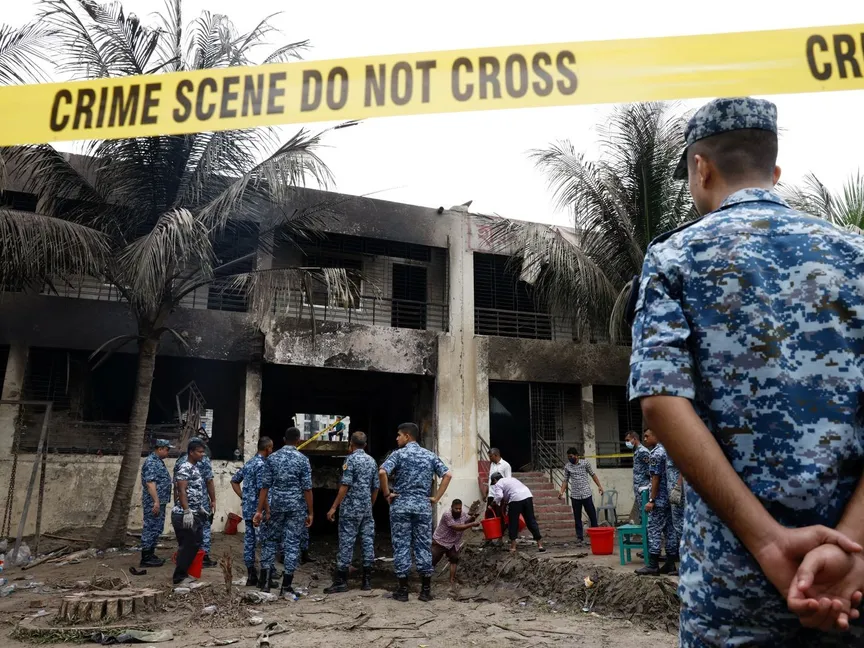 أعضاء من القوات الجوية البنجلاديشية يقومون بالتحقيق في الموقع، بعد تحطم طائرة تدريب تابعة للقوات الجوية في مبنى تابع لحرم مدرسة وكلية مايلستون، في دكا، بنجلاديش، 22 يوليو 2025 - REUTERS