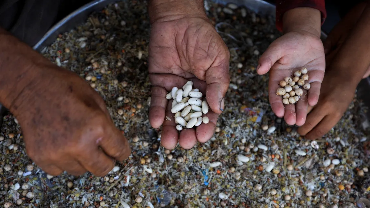 نازحون فلسطينيون فشلوا في العثور على مساعدات إنسانية يحاولون تنقية بقايا الطعام من بين التراب في غزة. 28 يوليو 2025 - REUTERS