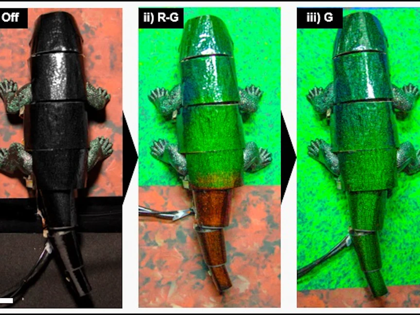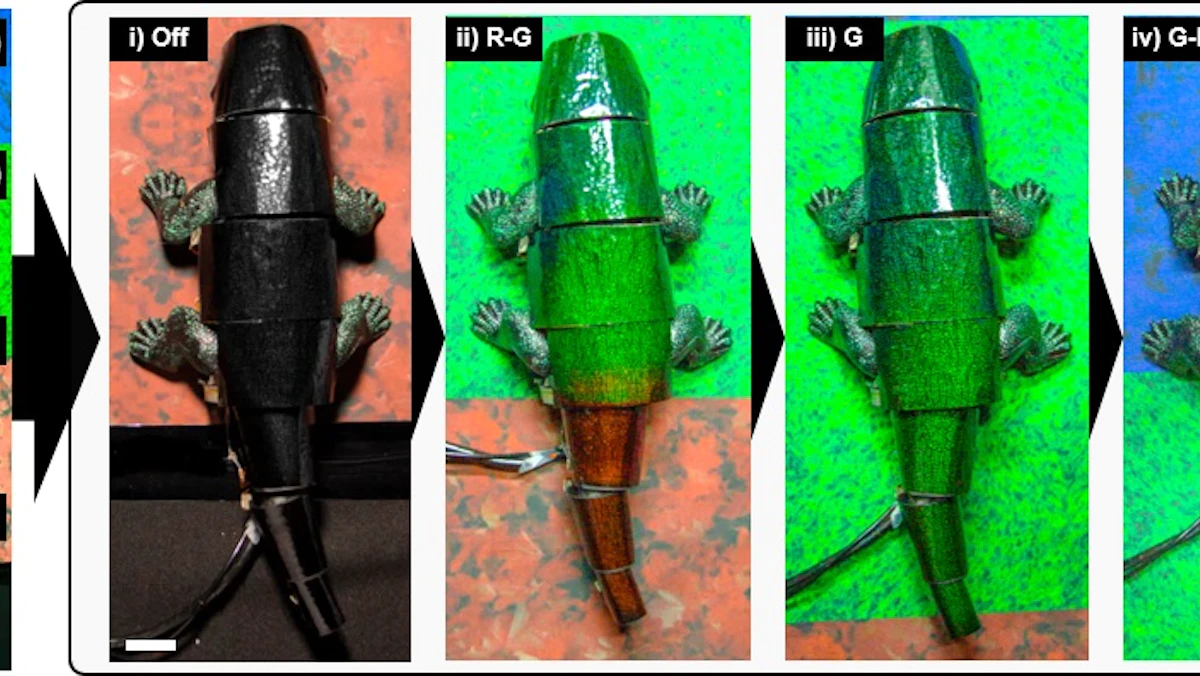 وصنع الباحثون "جلد الحرباء الصناعي" وألبسوه على روبوت رقيق الجسم، مشيرين إلى أن الروبوت يمكنه اكتشاف لون الخلفية البيئية ويمكنه تغيير لونه ليتناسب مع محيطه في الوقت الفعلي.