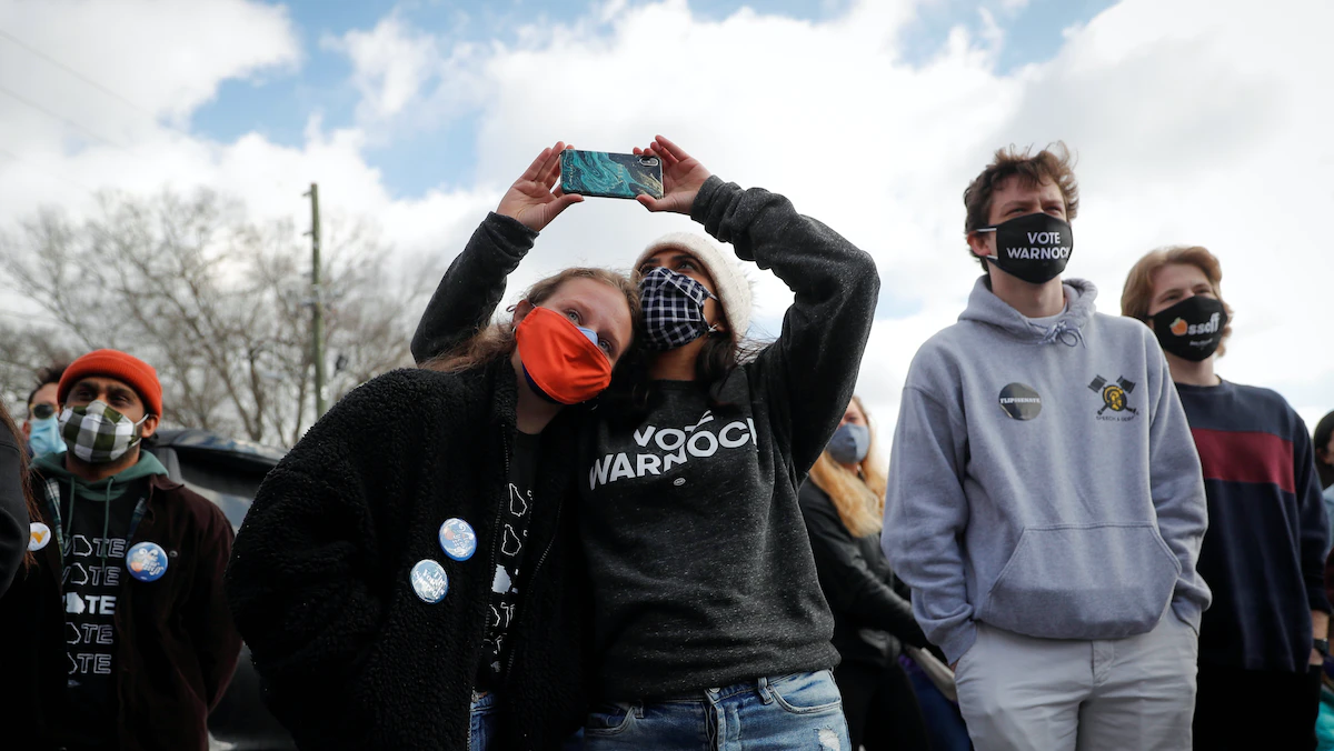 شباب أميركيون يشاركون في مسيرة مؤيدة للمرشح الديمقراطي بمجلس الشيوخ رافائيل وارنوك في جورجيا- 5 يناير 2021 - REUTERS