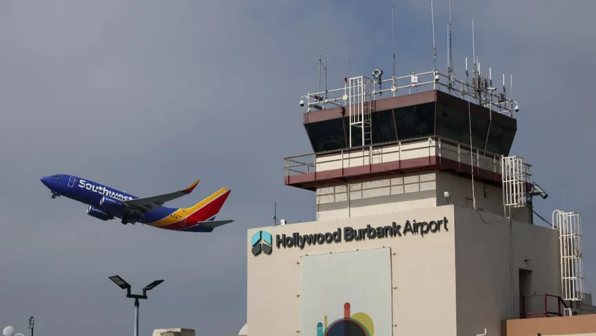 طائرة تقلع من مطار هوليود بوربانك في هوليوود مع استئناف العمليات غداة تشغيل المطار لساعات دون موظفين في مركز المراقبة بلوس أنجلوس. 7 أكتوبر 2025 - REUTERS