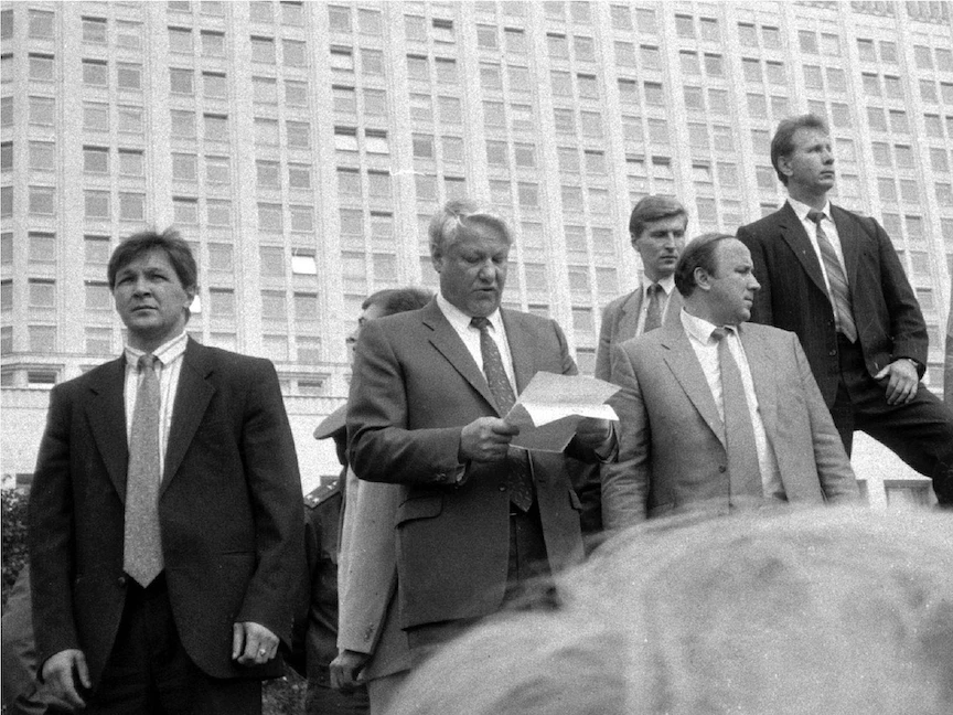 ومنذ الساعة الأولى، تولى الرئيس بوريس يلتسين قيادة المقاومة. وقبيل الظهر، أدان التحرك من البرلمان الروسي المحاصر بالدبابات وحيث تحصن، معتبراً أنه "انقلاب يميني ورجعي وغير دستوري".