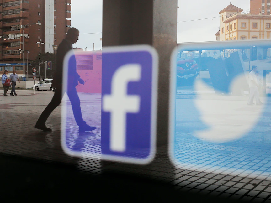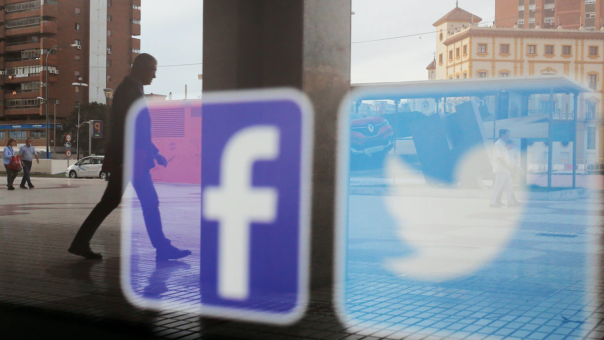 شعارا "فيسبوك" و"تويتر" يظهران على نافذة متجر في إسبانيا- 4 يونيو 2018 - REUTERS