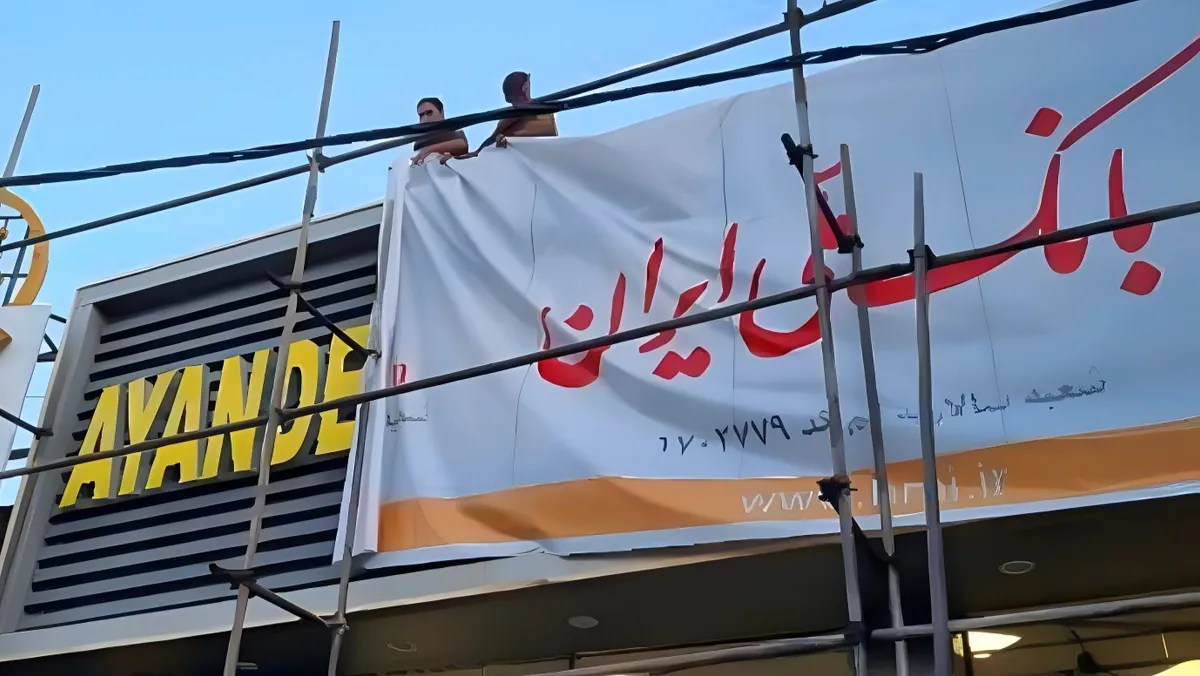 عمال يوارون لافتة 'بنك آينده' الخاص بلافتة جديدة بعد قرار البنك المركزي الإيراني بحلّه ودمجه في بنك 'ملي' الحكومي. - متداولة عبر وسائل التواصل الاجتماعي